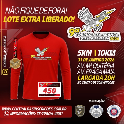 A 9ª CORRIDA ASA BRANCA será realizada no dia 31 de janeiro de 2026, no município de Feira de Santana – BA, com largada às 20:00h. O circuito terá dois percursos: 10 km (prova oficial) e 5 km (prova de participação), que ocorrerão nas principais avenidas da cidade de Feira de Santana - BA.